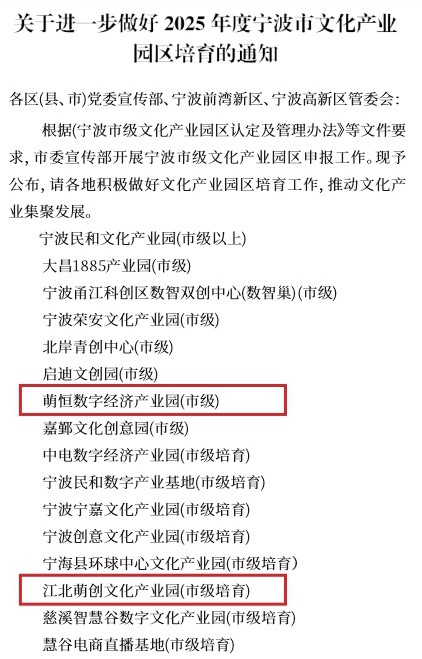 ]]>近年來,寧波市大力推動文化產業(yè)發(fā)展,出臺多項政策助力產業(yè)升級。今年4月,為推動文化產業(yè)集聚發(fā)展,培育新型業(yè)態(tài),激發(fā)創(chuàng)新活力,打造增長新引擎,寧波市文化產業(yè)園區(qū)申報工作正式啟動,入選園區(qū)需在產業(yè)集聚、運營管理、社會效益等方面達到嚴格標準。兩個園區(qū)對標創(chuàng)建標準積極開展各項申報工作,并在激烈競爭中憑借綜合實力勝出,獲此殊榮。