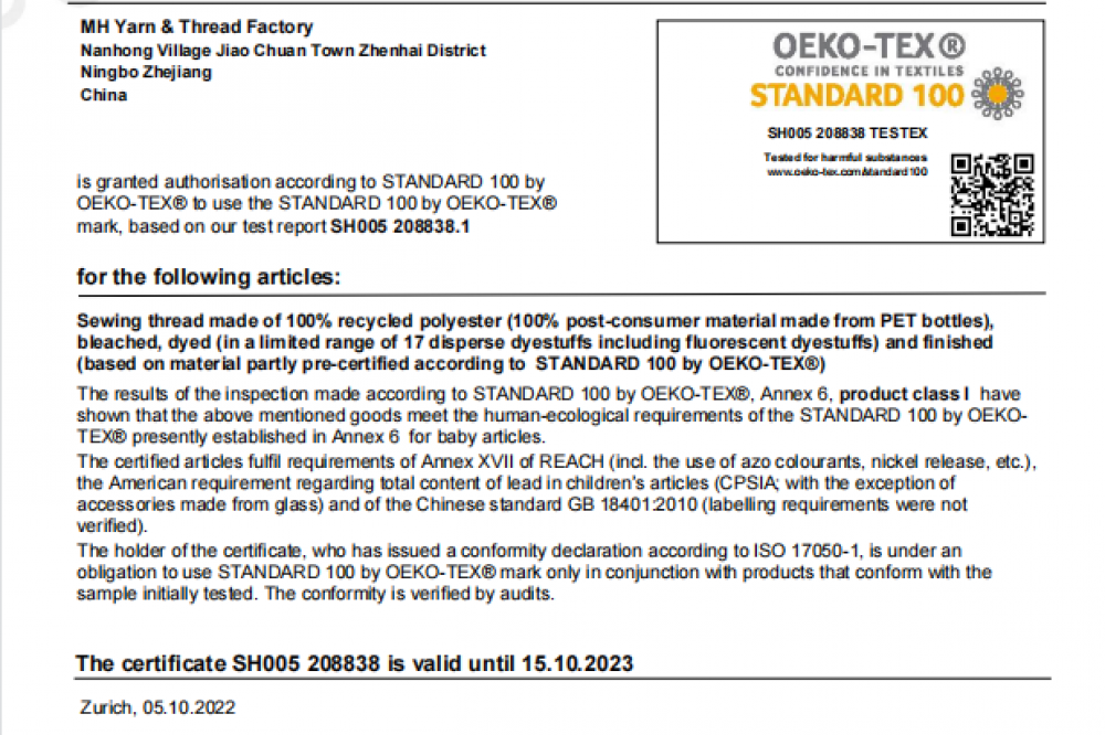 再生滌綸縫紉線通過生態紡織品標準認證